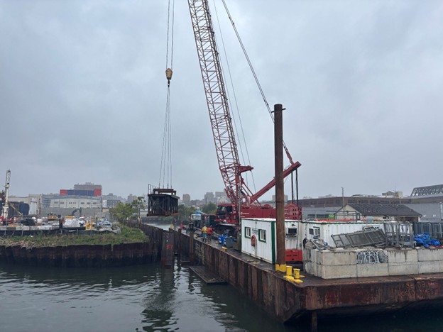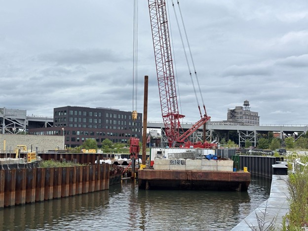 Bulkhead installation continued at the 6th Street Turning Basin. Tiebacks were installed. Preparations were made for additional upcoming sheet pile and tieback installation.