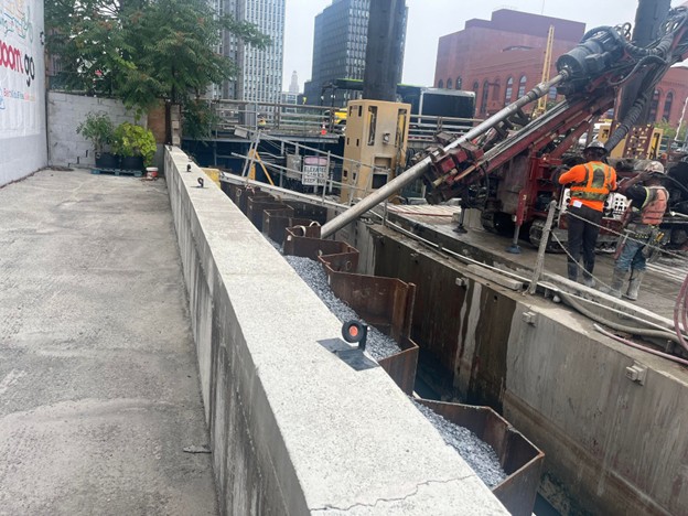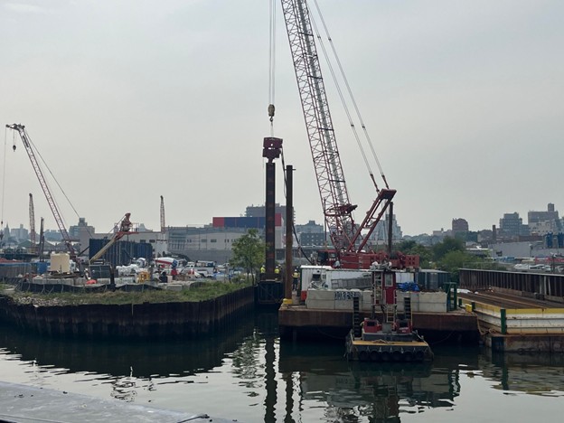 Bulkhead installation continued near 3rd Street. Tiebacks were installed. Grout was placed. Piles were driven.