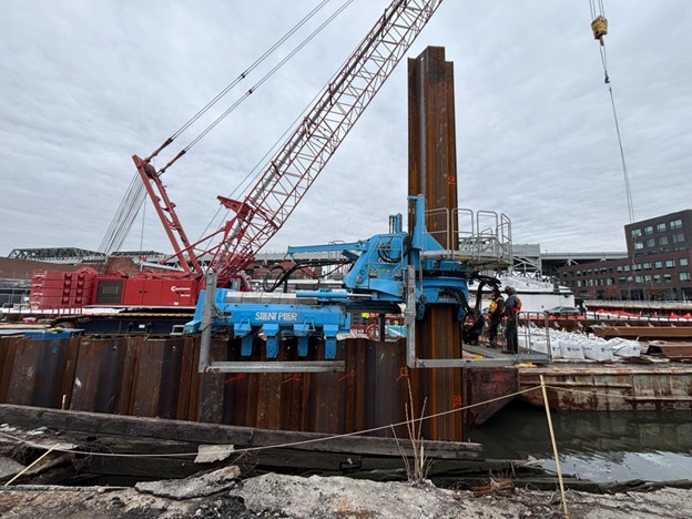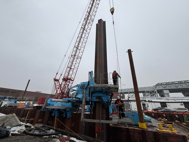 Bulkhead installation continued at the 7th Street Turning Basin. Underpinning of upland structures continued. Sheet piles were installed.