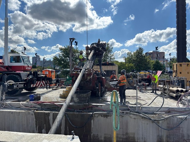 Bulkhead installation continued near 3rd Street. Tiebacks were installed. Grout was placed. Drain outlets were installed.